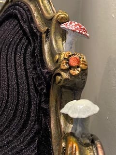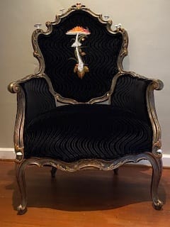 The chair is upholstered in a textured black velvet, a rare and discontinued fabric, adding luxury to its unique charm. The frame, salvaged from the streets of North Portland, has been lovingly restored and painted in rich pigments reflecting the fall hues of our forests. The carved rosette and curved details are highlighted with subtle reds and mossy greens, perfectly complementing the amanita appliqué on the inside backrest.