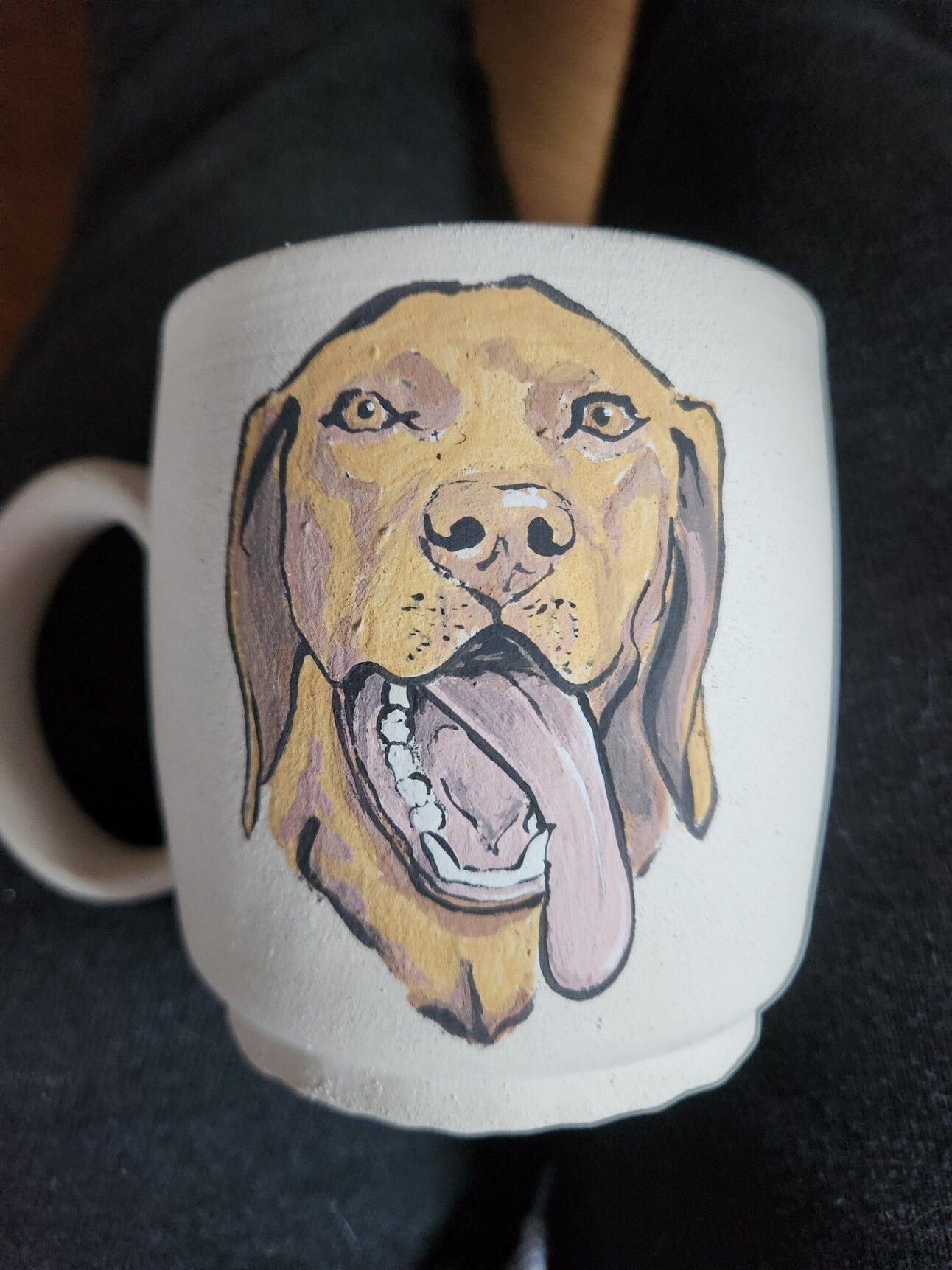 Handmade pottery and custom pet portrait of Tucker repping the 49ers