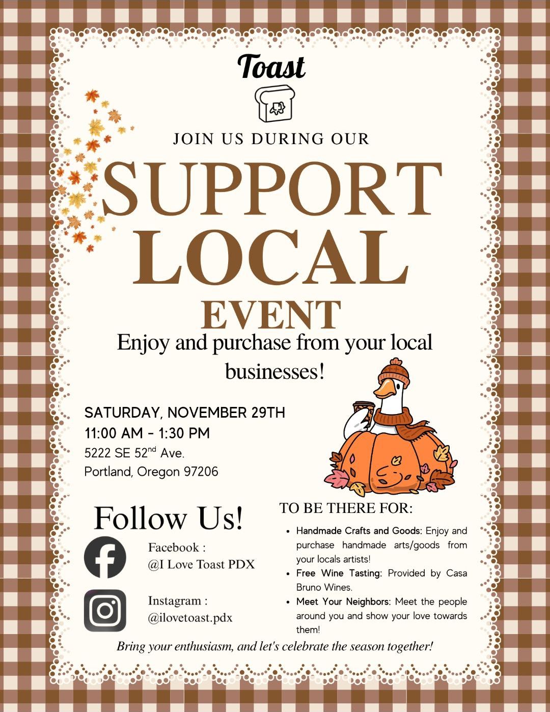 Celebrate the season by shopping local handmade crafts and goods, taking part in free wine tasting, and meeting your neighbors at Toast (5222 SE 52nd Ave) on Saturday, November 29, 2025, from 11 AM - 1:30 PM.