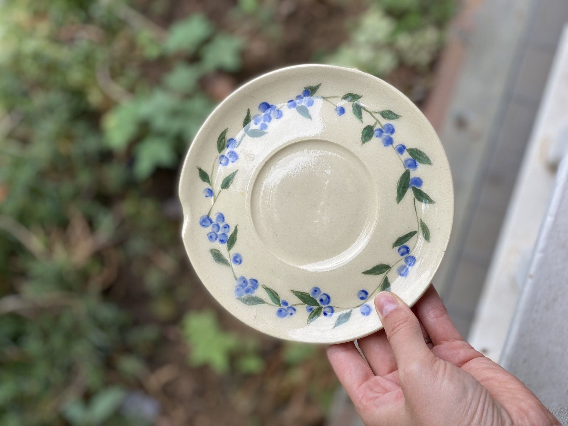 Blueberries cup and saucer — for early fall days wedged between summer and autumn. This set came together beautifully! I kept the colors minimal — just slightly darker and lighter shades of the same blue and green underglaze to suggest some depth. Inspired by my sister Bryn and her garden!